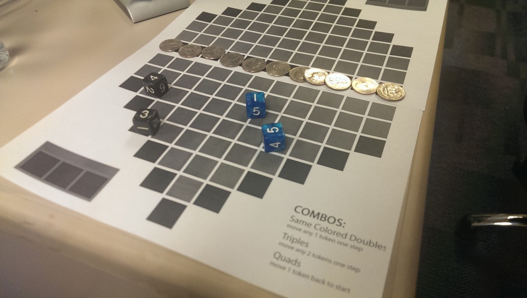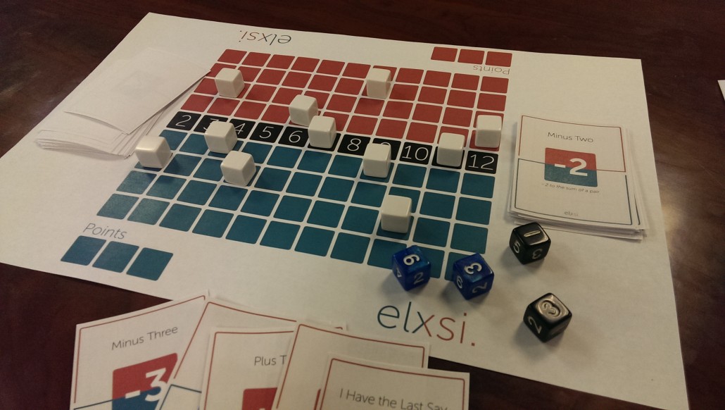 Elxsi. is a 2-player dice-based board game. Players take turns rolling 4 dice and pair them up in any way they wish to decide which 2 tokens they can move on the board. All tokens on the board are neutral pieces, not belonging to any player, and they start in the center of the board. Every token can be moved by either player, allowing players to move tokens towards their side of the board and away from the opponent’s board. The players’ goal is to move a total of 3 tokens to their end of the board.